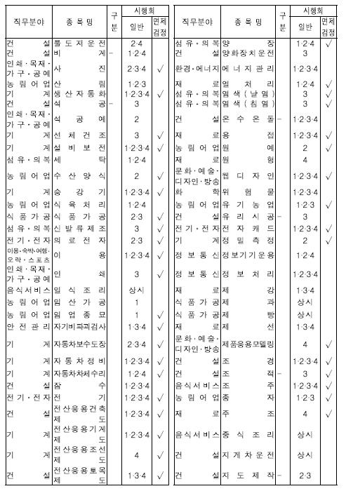 운전.운송 : 농기계운전기능사 이용.미용 : 이용사 조리 : 복어조리기능사,조주기능사 토목 : 잠수기능사,측량기능사 건설배관 : 배관기능사 건설기계운전 : 기중기운전기능사,로더운전기능사,롤러운전기능사,불도저운전기능사,천공기운전기능사,천장크레인운전기능사,컨테이너크레인운전기능사,타워크레인운전기능사 기계제작 : 공유압기능사,기계가공조립기능사,컴퓨터응용밀링기능사,컴퓨터응용선반기능사 기계장비설비.설치 : 건설기계정비기능사,궤도장비정비기능사,농기계정비기능사,반도체장비유지보수기능사,생산자동화기능사,승강기기능사 항공 : 항공기관정비기능사,항공기체정비기능사,항공장비정비기능사,항공전자정비기능사 자동차 : 자동차보수도장기능사,자동차정비기능사,자동차차체수리기능사 금형.공작기계 : 금형기능사 금속.재료 : 열처리기능사 판금.제관.새시 : 플라스틱창호기능사 단조.주조 : 원형기능사,주조기능사 용접 : 용접기능사,특수용접기능사 도장.도금 : 금속도장기능사,표면처리기능사 의복 : 세탁기능사,양장기능사,한복기능사 전기 : 전기기능사 전자 : 3D프린터운용기능사,전자계산기기능사,전자기기기능사 정보기술 : 정보기기운용기능사 제과.제빵 : 떡제조기능사 인쇄.사진 : 사진기능사,인쇄기능사,전자출판기능사 목재.가구.공예 : 귀금속가공기능사,목공예기능사 농업 : 화훼장식기능사 축산 : 식육처리기능사 임업 : 버섯종균기능사 비파괴검사 : 방사선비파괴검사기능사,자기비파괴검사기능사,침투비파괴검사기능사 환경 : 환경기능사 에너지.기상 : 에너지관리기능사 |