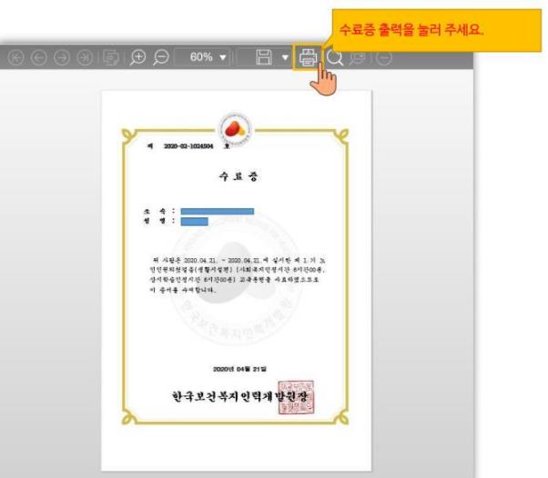 강의 이수가 완료된후 학습종료가 뜬후 설문조사를 완료 한후 응답제출을 클릭하면 수료증을 출력할수 있습니다.