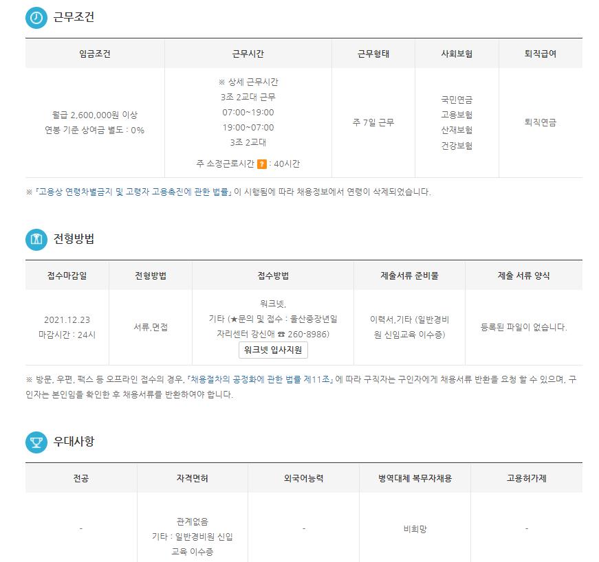 우대사항으로 일반경비원 신입 교육을 미리 이수하셨다면 조금더 우대됩니다.