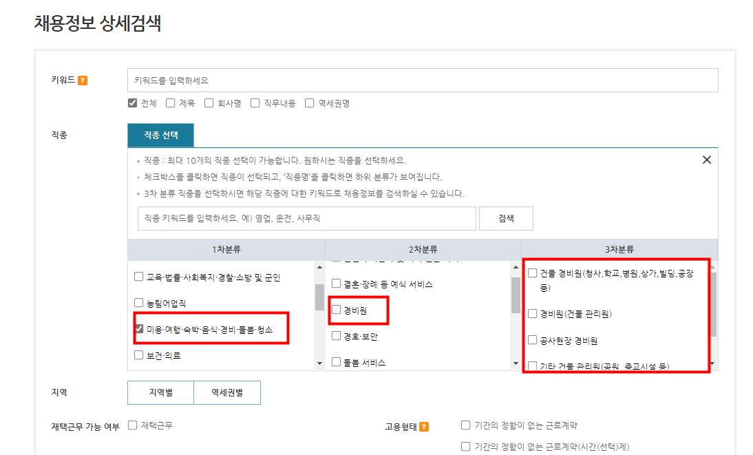 채용정보 상세 검색에서 1차분류[미용,여행,숙박,음식,경비,돌봄,청소]-2차분류[경비원]을 선택한후 검색합니다.