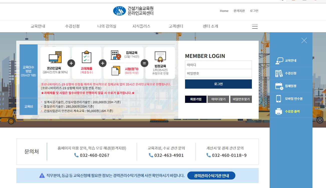 건설기술교육원온라인교육센터 홈페이지(ekicte.or.kr)에 접속해 회원가입과 로그인후 최초교육을 신청하면 강의를 이수할수 있습니다.