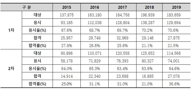 1차 시험 합격률은 약 20~30% 내외이며 2차시험도 20~30% 합격내외입니다. 1년에 한번치뤄지며 생각보다 많은 인원이 응시하지만 그에 비해 적절히 합격률이니 나오는거 같습니다.