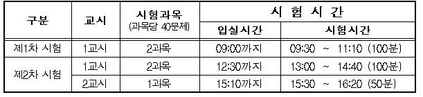 - 시험시간 : 1교시 100분(13:00~14:40), 2교시 50분( 15:30~16:20)