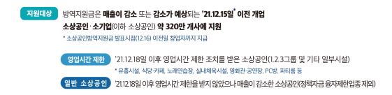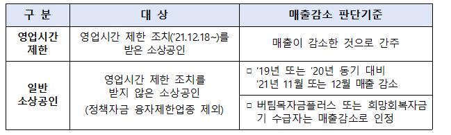 일반 소상공인중에서는 12월 18일 이후 영업시간 제한을 받지 않았으나 매출이 감소한 소상공인이 해다됩니다.