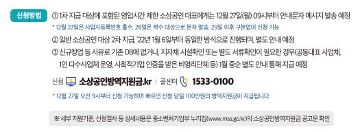 1차 방역지원금 대상자는 12월 27일 월요일 오전 9시부터 안내문자가 발송될 예정이며 특히 27일에는 사업자등록번호가 끝자리가 홀수인 업체에게, 28일에는 짝수를 대상으로 문자가 발송되어 소상공인방역지원금.KR홈페이지에서 신청이 가능합니다.