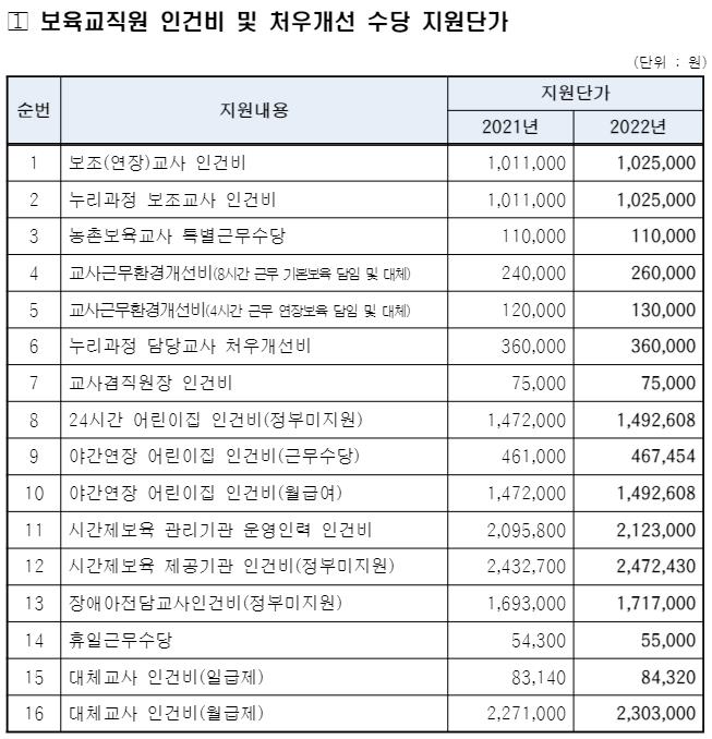 | 2 | 누리과정 보조교사 인건비 | 1,011,000 | 1,025,000 |