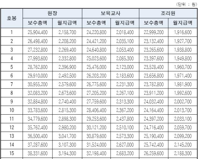 1호봉~15호봉의 원장,보육교사,조리원 인건비 지급기준 연봉과 월 급여입니다.