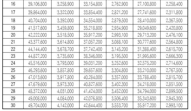 | 16호봉 | 39,106,800 | 3,258,900 | 33,154,800 | 2,762,900 | 27,100,800 | 2,258,400 |