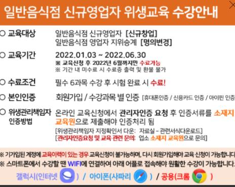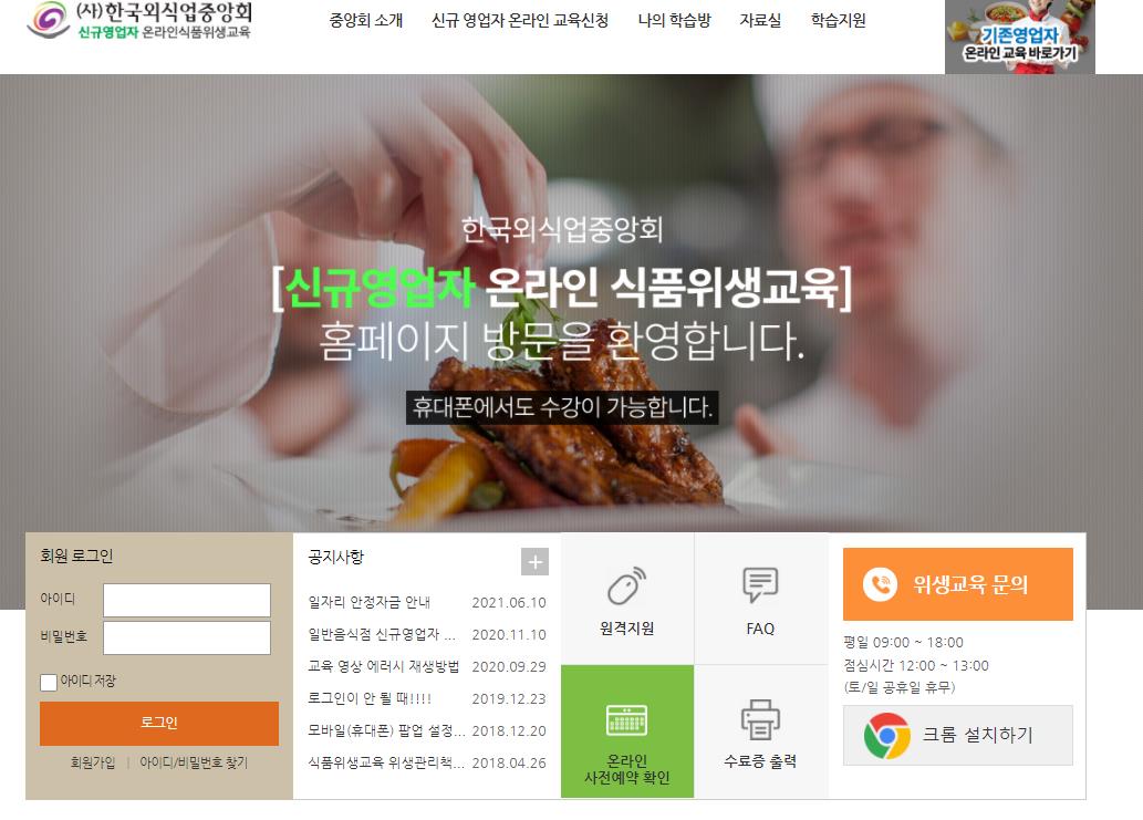 음식점을 창업하거나 명의를 변경하시려는 분들은 반드시 한국외식중앙회의 일반음식점 신규영업자 위생교육을 이수해야합니다. 최근 코로나로인해 온라인교육으로 진행되고 있어서 창업을 준비하고 계신분들은 시간되실때 이수하는게 좋습니다.