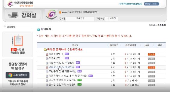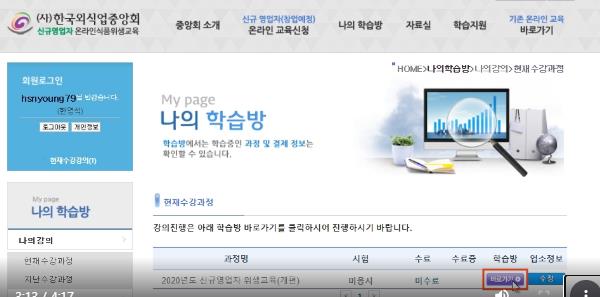 수강신청 완료후 나의 학습방에서 신규영업자 위생교육 학습방[바로가기]를 선택합니다.