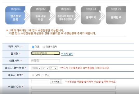 그후 직책(대표,위생책임자),업체명,영업자 주소등을 작성후 결제를 하면 수강신청이 완료됩니다.