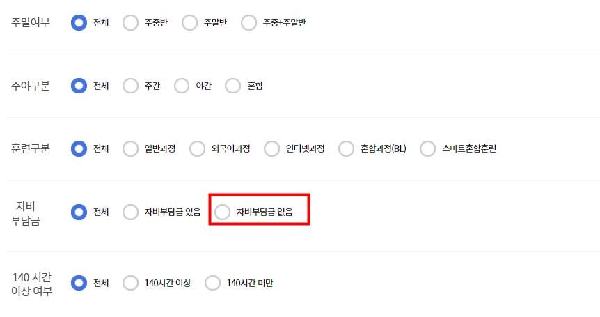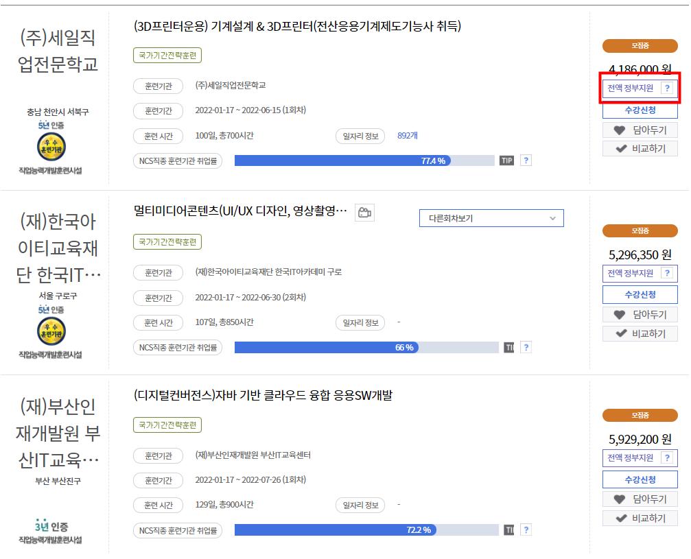 그럼 검색결과에 '전액정부지원'이라는 항목이 오른쪽에 뜨면 전부 국비지원되서 무료로 교육과정을 들을수 있게 됩니다.