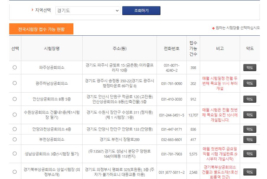 시험장명과 주소,전화번호,접수가능 건수와 상공회의소 약도가 나옵니다.