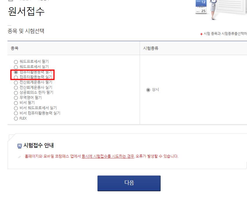 컴퓨터 활용능력과 필기,실기는 별도로 접수를 받습니다.