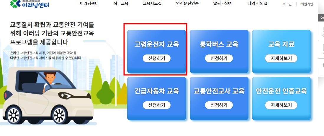 고령자 운전교육은 도로교통공단 이러닝센터홈페이지(trafficedu.koroad.or.kr)에서 신청후 온라인으로 이수 할수 있습니다.