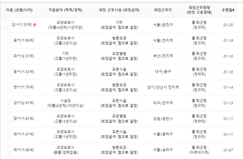 위처럼 성별과 나이,지원분야,희망근무시설,희망근무지등 구직을 원하는 요양보호사 리스트들이 나타납니다.