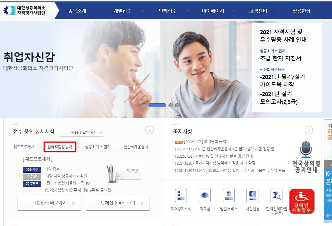 홈페이지에서 [컴퓨터활용능력]-[개인접수 바로가기로]이동합니다.