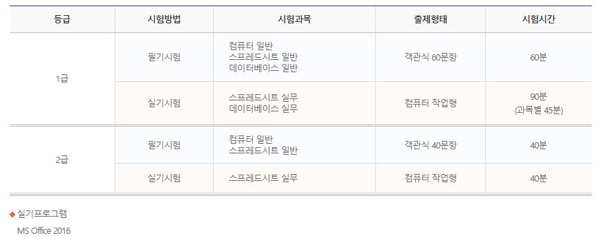 2급은 필기시험에서 컴퓨터일반,스트레드시트 시험과목으로 40문항을 40분동안 풀어야 합니다.