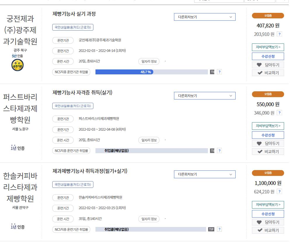 국민취업지원제도이거나 취업성공패키지,근로장려금 수급자의 경우 유형별로 자비 부담액이 조금 더 줄어들 수 있습니다. 자비부담액이 없는 경우도 있지만 대체적으로 제빵기능사 제과기능사는 자비부담액이 있습니다.