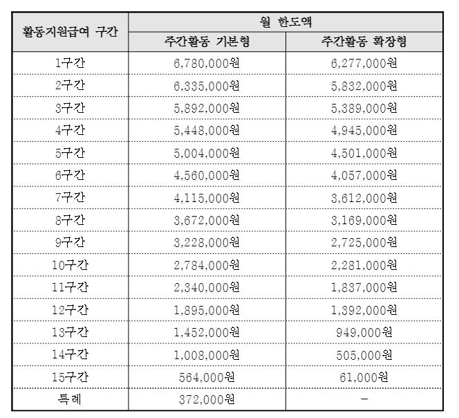 | 기준중위소득 180% | 활동지원급여 월 한도액 10% |