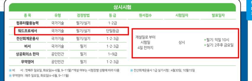 워드프로세서는 컴퓨터활용능력등과 더불어 상시시험으로 개설일로부터 시험일 4일전까지 접수가 가능합니다.