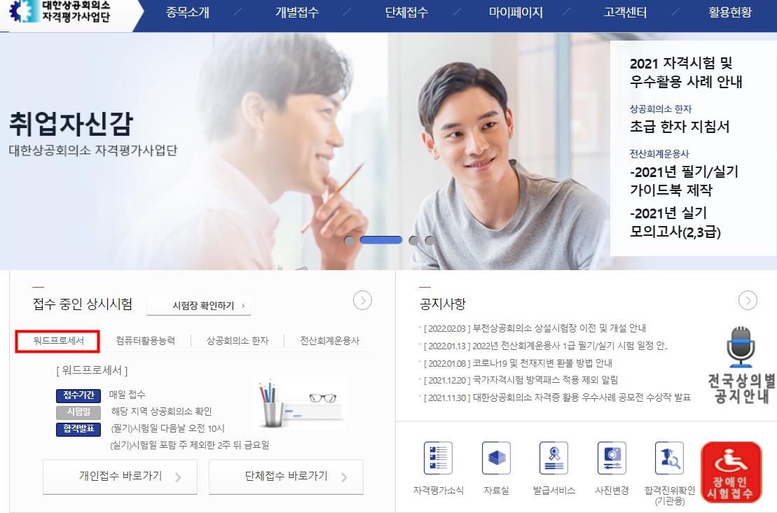 워드프로세서 상시시험 필기와 실기 시험은 대한상공회의소 자격평가사업단홈페이지(license.korcham.net)에서 온라인으로 접수 할수 있습니다.