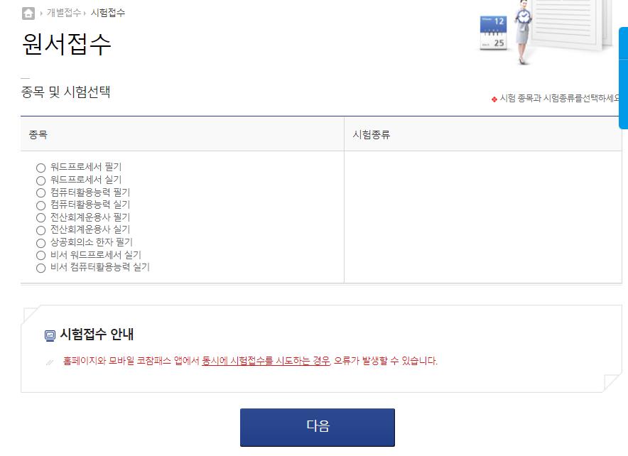 워드프로세서 필기,실기를 선택한후 다음페이지로 넘어가 접수를 진행합니다.