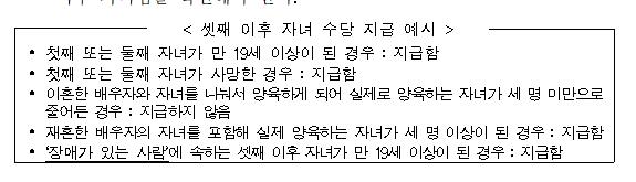 - 자녀 : 첫째자녀 2만원, 둘째자녀 6만원, 셋째자녀이후 10만원