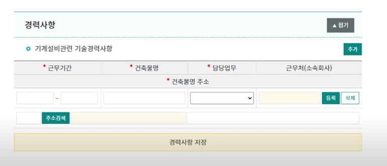 로그인후 유지관리자 경력신고페이지에서 위처럼 근무기관과 건축물명,담당업무, 근무처 소속회사등을 작성후 경력사항을 업데이트할수 있습니다.