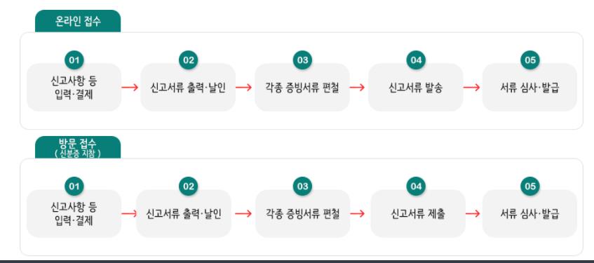온라인으로 해당 사이트에서 회원가입후 신고사항을 입력,결제후 신고서류를 발송해야 서류 심사후 발급이 가능합니다.