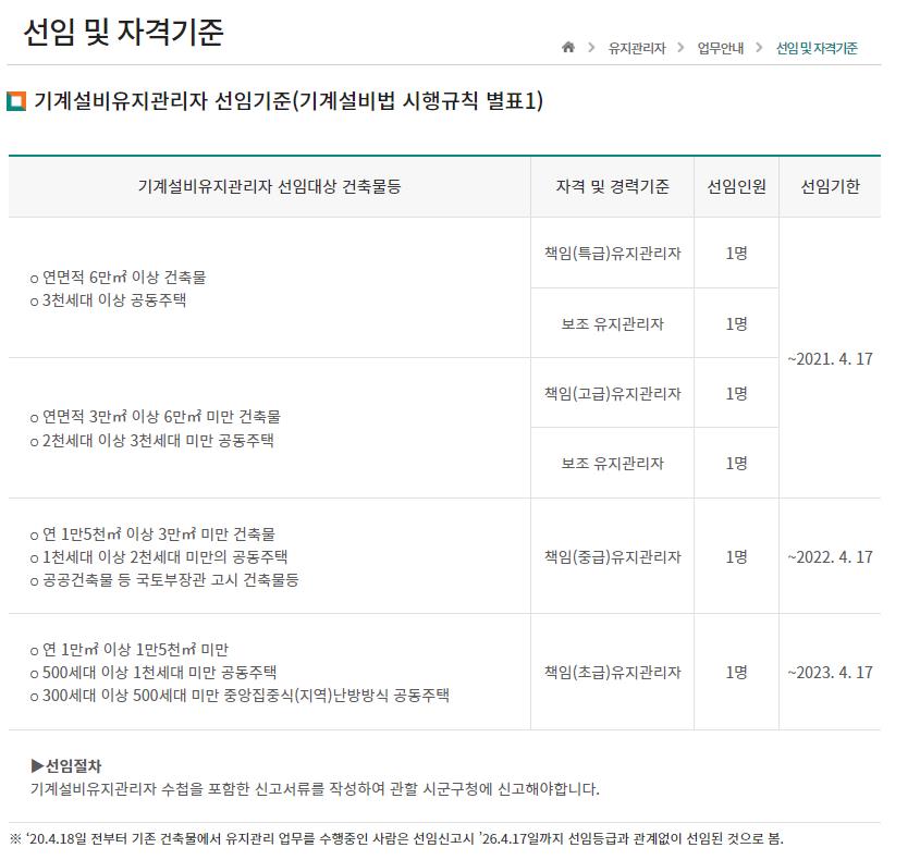 기계설비유지관리자에 대한 선임기준 기한이 2022년 4월 17일 이전까지인 건물을 경우 해당 사이트에서 선임을 신고해야합니다.
