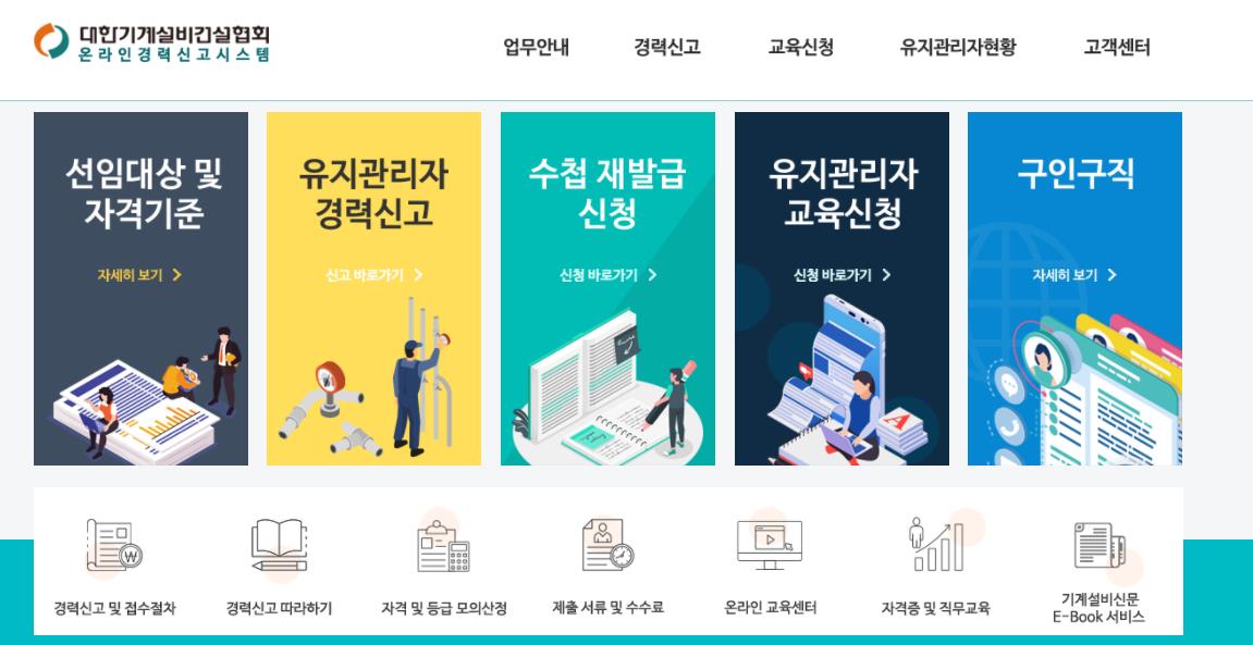 기계설비유지관리자 선임대상과 자격기준,경력신고,수첩재발급신고,교육신청, 직무교육,온라인교육센터등 다양한 서비스를 받을수 있습니다.