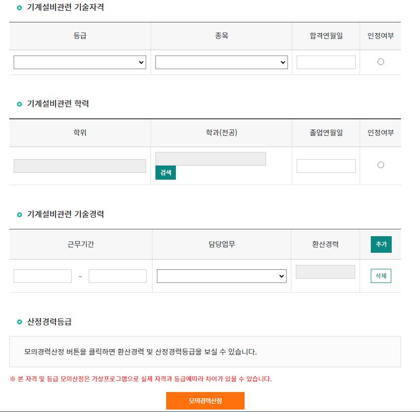 [경력신고메뉴]에서 나의 기계설비관련 등급과 근무기간등을 입력해 모의로 산정경력등급을 확인해볼수도 있습니다.