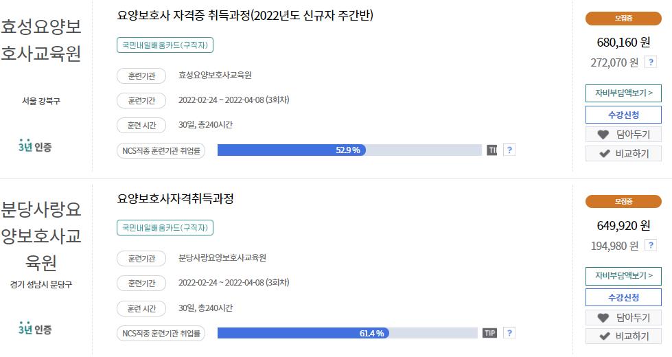 국민내일배움카드가 있다면 직업훈련포털에서 요양보호사를 검색하면 국비지원대상 교육기관과 훈련과정을 찾아볼수 있습니다.