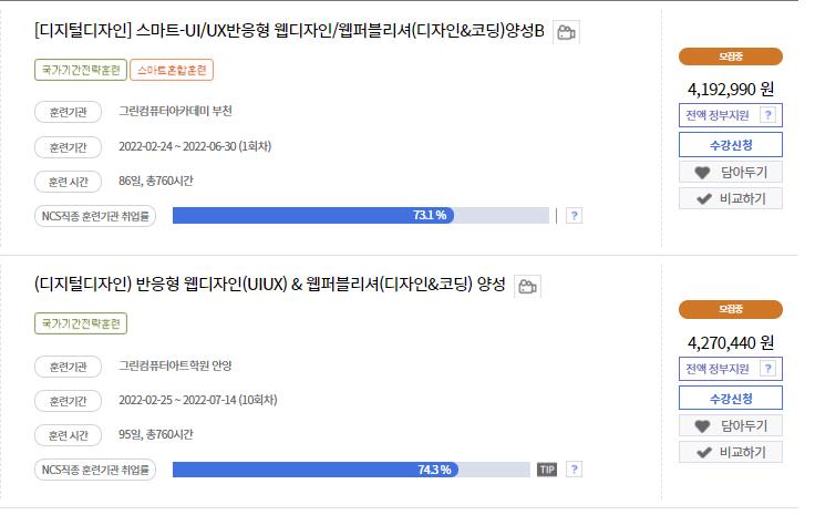 이렇게 정부에서 양성하는 디자인,코딩등 양성과정은 전액을 정부가 지원하는 경우가 많아서 관심이 있다면 취업을 위해 전액정부 지원과정을 찾아보는것도 좋습니다.
