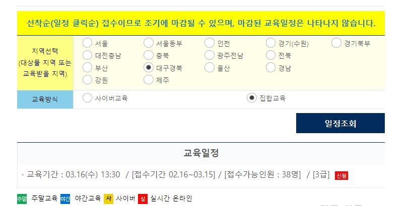 온라인이나 집합교육 일정은 각 지역별로 일정조회를 선택해 확인이 가능합니다.