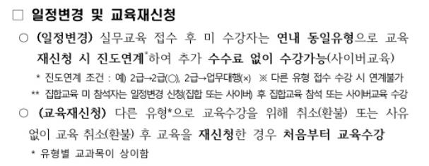 실무교육을 신청후 동일 유형으로 년도내에 재신청하면 진도연계로 수수료 없이 수강이 가능합니다.