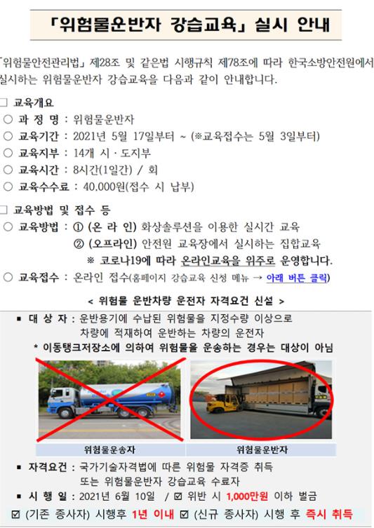 또한 국가기술자격법에 따른 위험물 분야의 자격을 취득해야하며 안전원에서 실시하는 위험물 운반자 강습교육을 수료해야합니다.