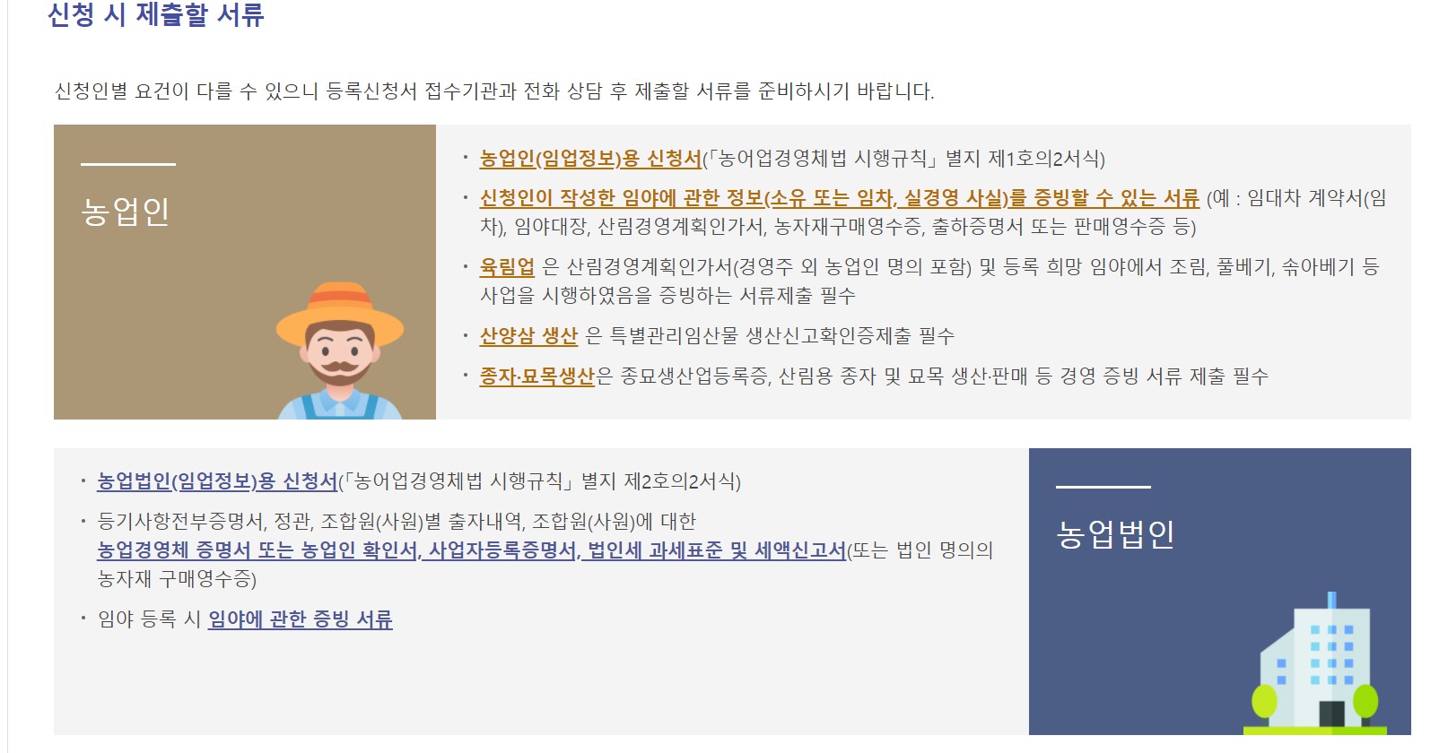 임업경영체 등록시 제출해야하는 서류는 농업인(임업인),임업법인마다 조금씩 다릅니다.