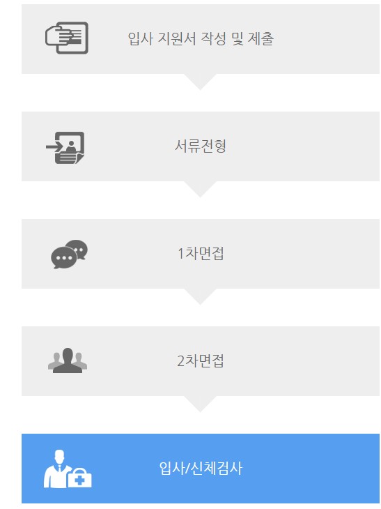 기본적으로 채용절차는 입사지원서 작성제출휴 서류전형-1차면접-2차면접-신체검사까지 진행됩니다.