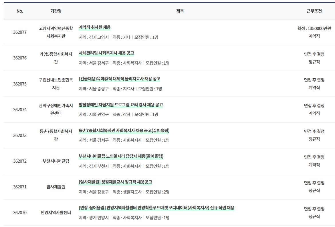 사회복지관이나 노인종합복지관,자애인가족지원센터,시니어클럽,재활원,지역자활센터등의 직원채용공고를 볼수 있습니다.