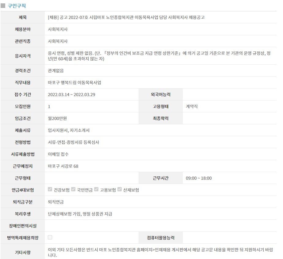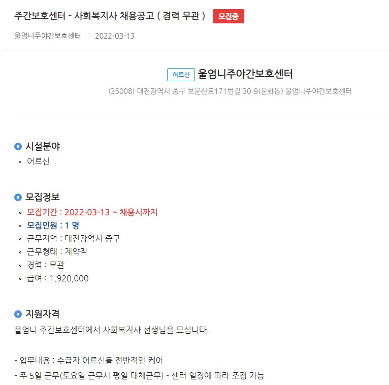 영양사,육아휴직대체자 물리치료사,운전원등 사회복지사 외에도 사회복지시설관련한 채용정보가 올라옵니다.