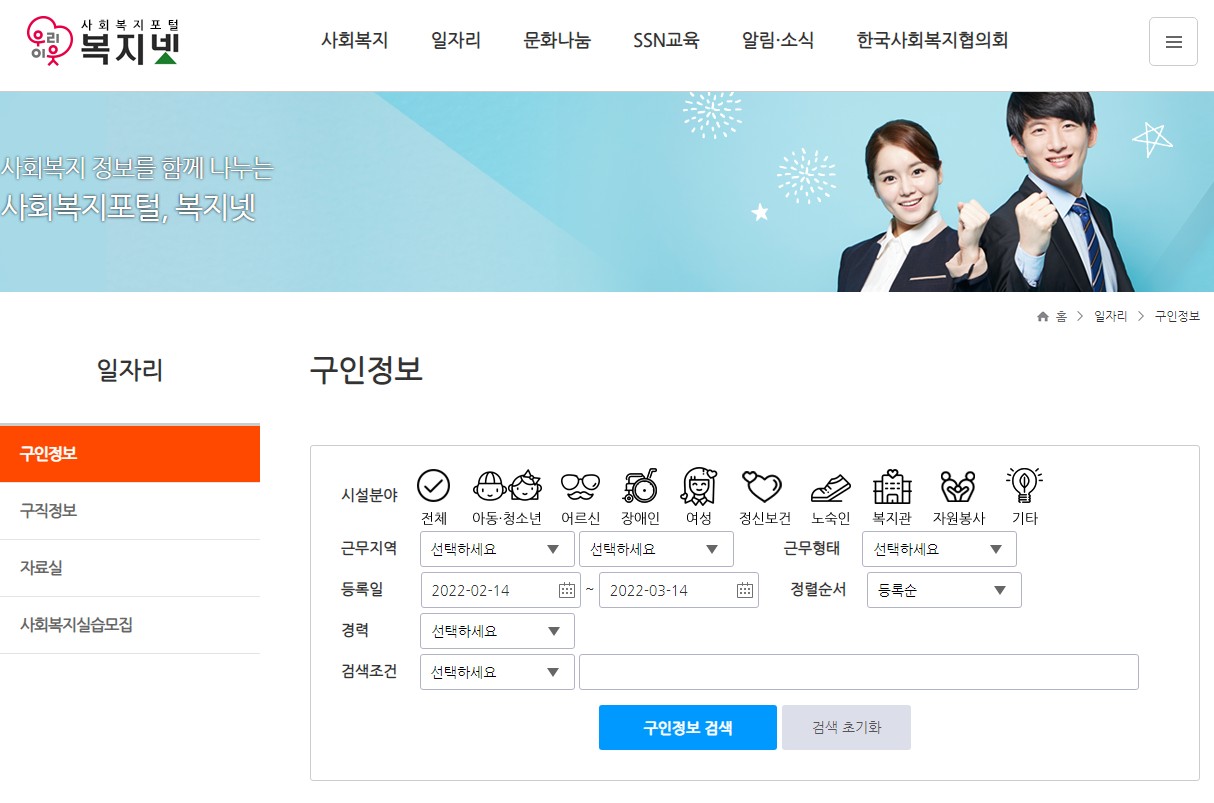 복지넷 홈페이지에서 [일자리]-[구직정보]에서 사회복지사 관련 구인구직 정보를 확인할수 있습니다.