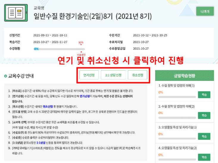 연기 신청은 수강기간내 동일과정,당해년도 수강일정에 한해서만 연기 신청이 가능하며 수강진도는 반영되지 않습니다.