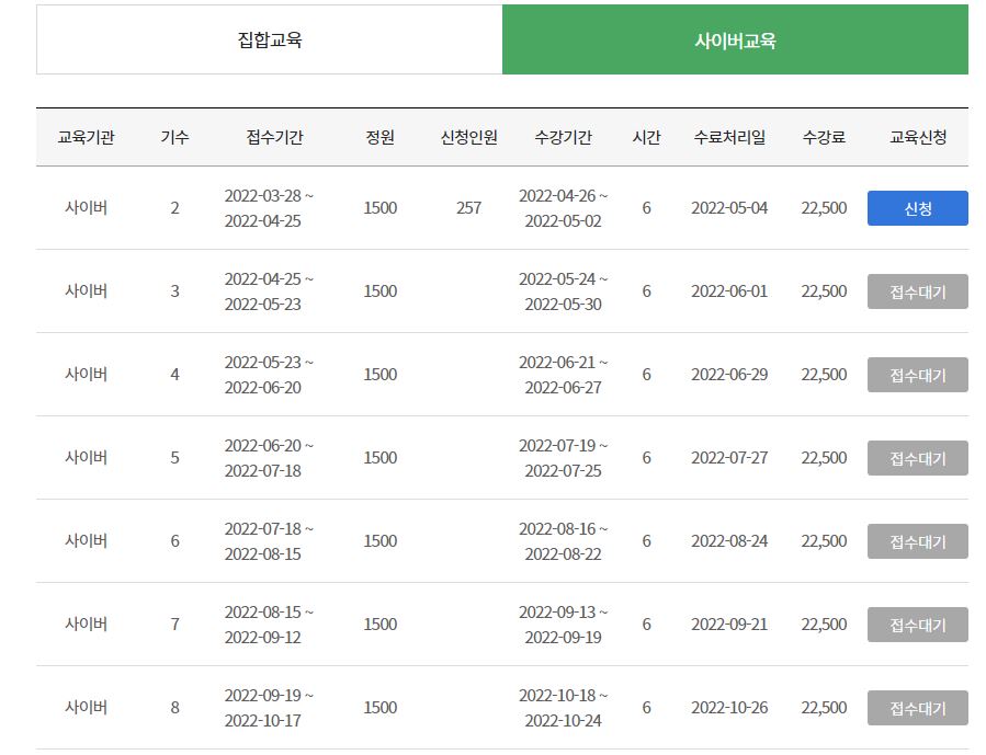 교육일정에 따라 집합교육,사이버 교육 신청을 진행합니다.