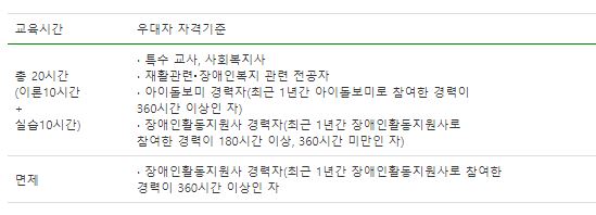 또한 특수교사나 사회복지사,재활관련,장애인복지 관련전공자,장애인활동지원사나 아이돌보미로 최근 1년간 참여한 경력이 있다면 우대 되며 교육 시간도 줄어듭니다.