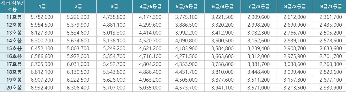 | 11호봉 | 5,782,600 | 5,226,200 | 4,738,800 | 4,177,300 | 3,775,100 | 3,221,500 | 2,909,600 | 2,612,000 | 2,361,700 |