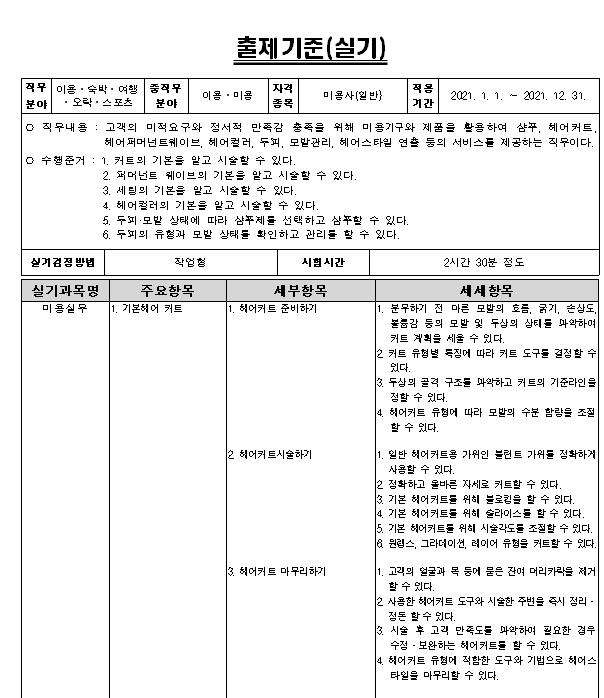 실기시험은 커트를 기본으로 말고 수행할수 있는지, 퍼머넌트웨이브와 세팅,헤어컬러의 기능을 알고 시술할수 있는지와 두피 모발 상태에 따라 샴푸를 선택하며 두피유형과 모발상태를 확인하고 관리를 할수 있는지를 평가하게 됩니다.