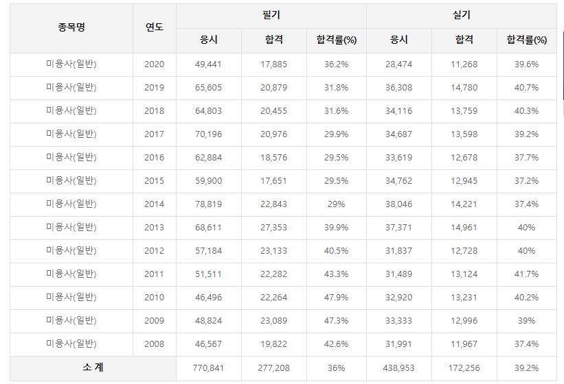 미용사 시험은 필기시험만하더라도 응시자가 4~6만명으로 꾸준하며 거기서 합격률은 30%내외가 합격하게 됩니다.