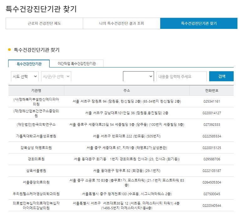 배치전 건강검진 병원은 안전보건공단홈페이지(www.kosha.or.kr)에서 [사업소개]-[특수건강진단]-[특수건강진단기관 찾기]에서 인근 병원을 찾아볼수 있습니다.